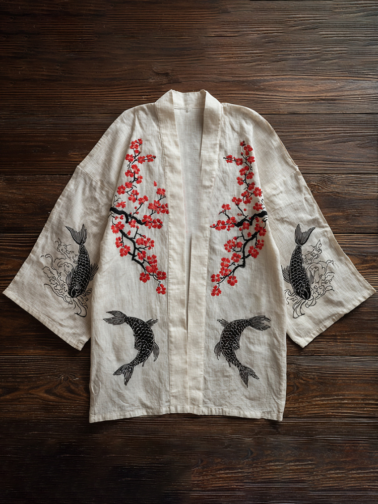 Men's Vintage Koi And Plum Blossoms Japanese Art Linen Blend Kimono Cardigan