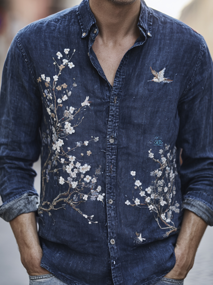 Japan Art Cherry Blossom Bird Denim Blue Cotton Linen Cardigan Shirt