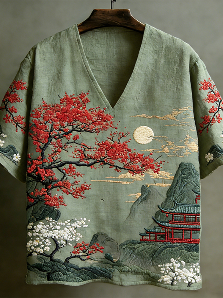 Men's Japanese-style Landscape Pattern Short-sleeved V-neck Shirt