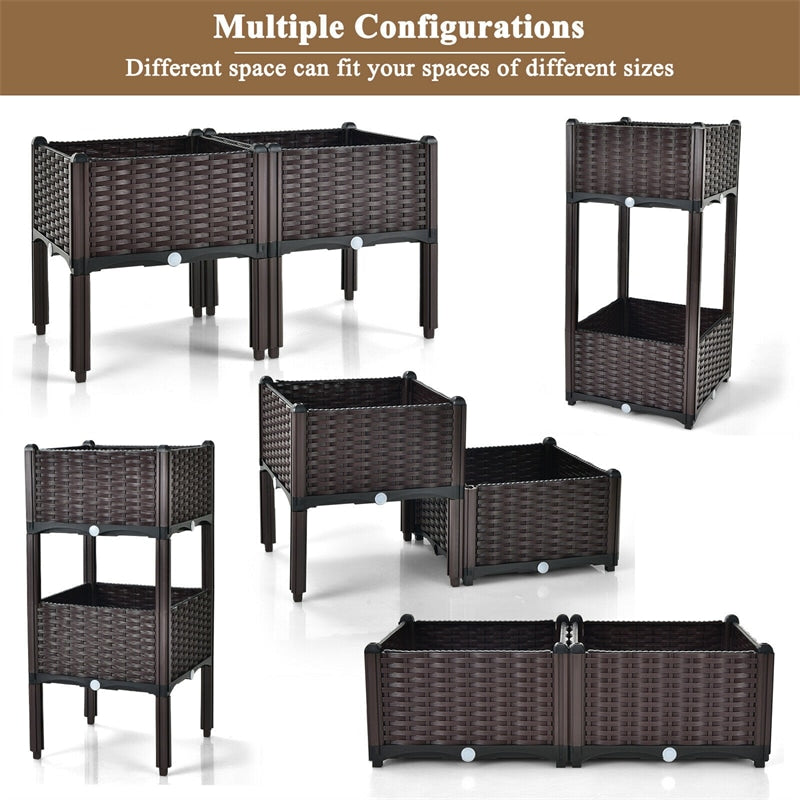 A Perfect Planting Helper to Make Your Garden Clean and Tidy! The raised garden bed kit is designed with 8 elevated legs and 2 planter boxes, allowing you to freely combine the garden boxes as you need. Made of premium PP materials, it is durable and weatherproof for long-lasting indoor and outdoor uses. Moreover, the PP materials are designed with rattan patterns, adding a sense of beauty and elegance to your space. What's more, this raised garden bed requires no tools for effortless assembly, just insert walls into the base plate and insert the columns along grooves of sideboards, and you can choose whether to install the elevated legs for different purposes. Other than that, it comes with a self-watering disk, a water storage box, and drainage holes for self-priming irrigation, allowing roots to aerate while having moisture nearby. Additionally, the elevated design is space-saving for planting vegetables, fruits, flowers, or herbs in the garden, patio, or backyard. With a stylish appearance and practical design, the planter growing boxes will be the perfect present for your family, friends, or colleagues!