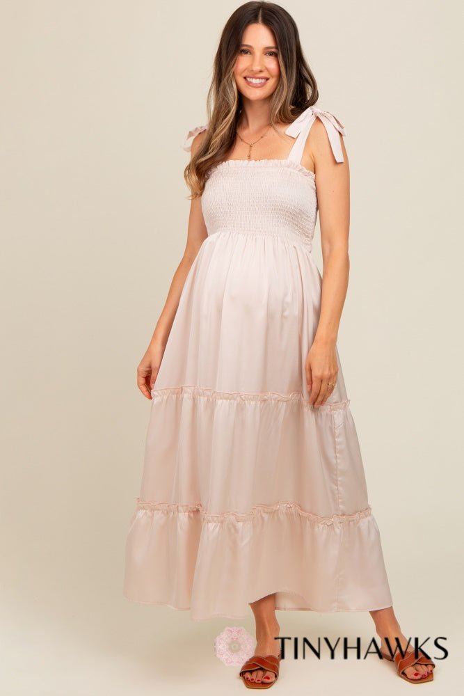 The Beige Satin Smocked Maternity Maxi Dress offers a perfect combination of elegance and comfort. With its luxurious satin fabric, smocked detailing, and flowing maxi length, this dress is ideal for a chic and sophisticated maternity look.