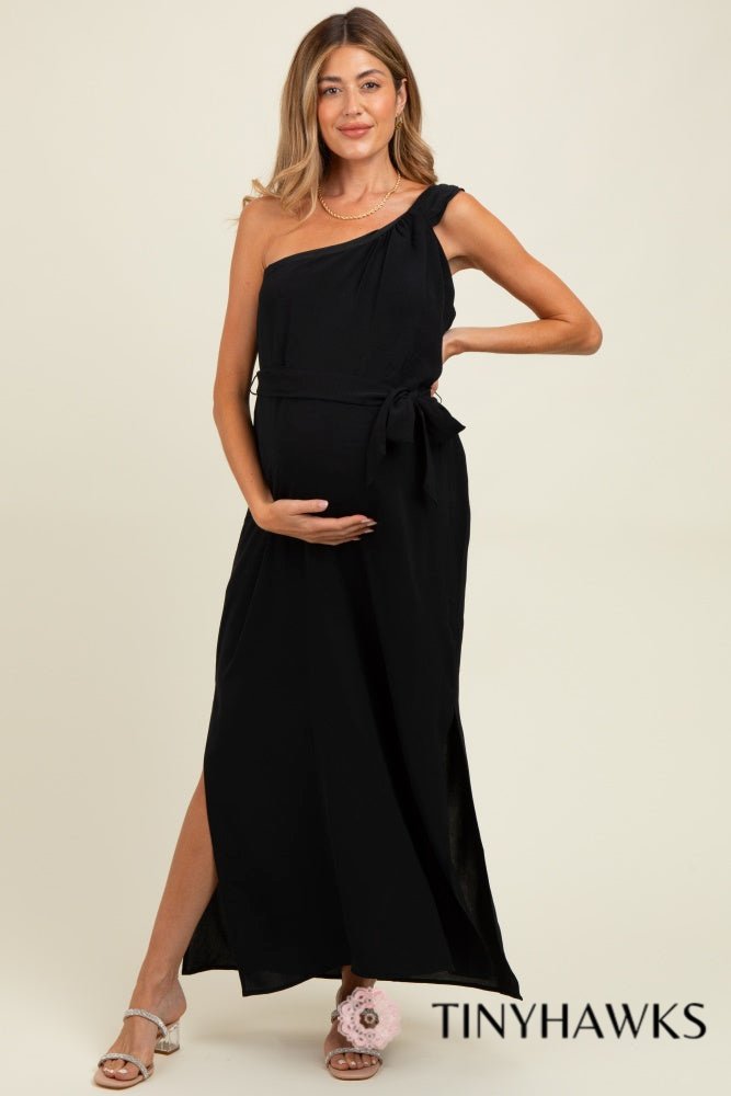 Step into motherhood with confidence and style. This striking black maxi dress features an asymmetrical silhouette that flatters your growing curves while making a bold fashion statement. Designed for the modern mama who refuses to compromise on elegance.