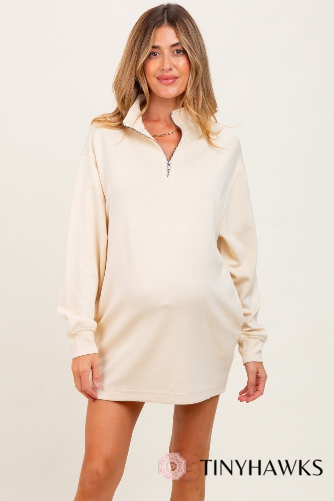 Stay stylish and comfortable throughout your pregnancy with our Cream Half Zip Long Sleeve Maternity Mini Dress. Crafted from soft, breathable fabric, this dress features a relaxed fit that gently hugs your growing bump, offering both support and room to move. The half-zip design adds a modern touch and allows for adjustable coverage, making it perfect for layering or warmer days. Long sleeves provide cozy warmth, while the mini length keeps the look fresh and youthful. Ideal for casual outings or lounging at home, this versatile maternity dress is a must-have for your pregnancy wardrobe. Easy to style and care for, it’s a chic way to embrace your glow.