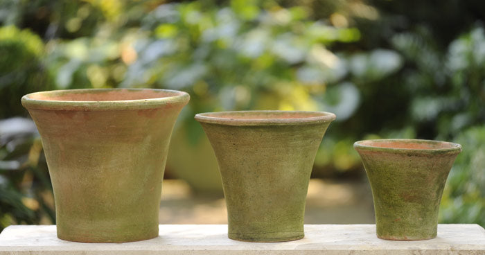 Our hand thrown terracotta pots are enhanced by natural moss. Once planted, watering your plant will turn the dormant moss into a lush green surface. In cold climates, the pots should be stored with the first heavy frost.