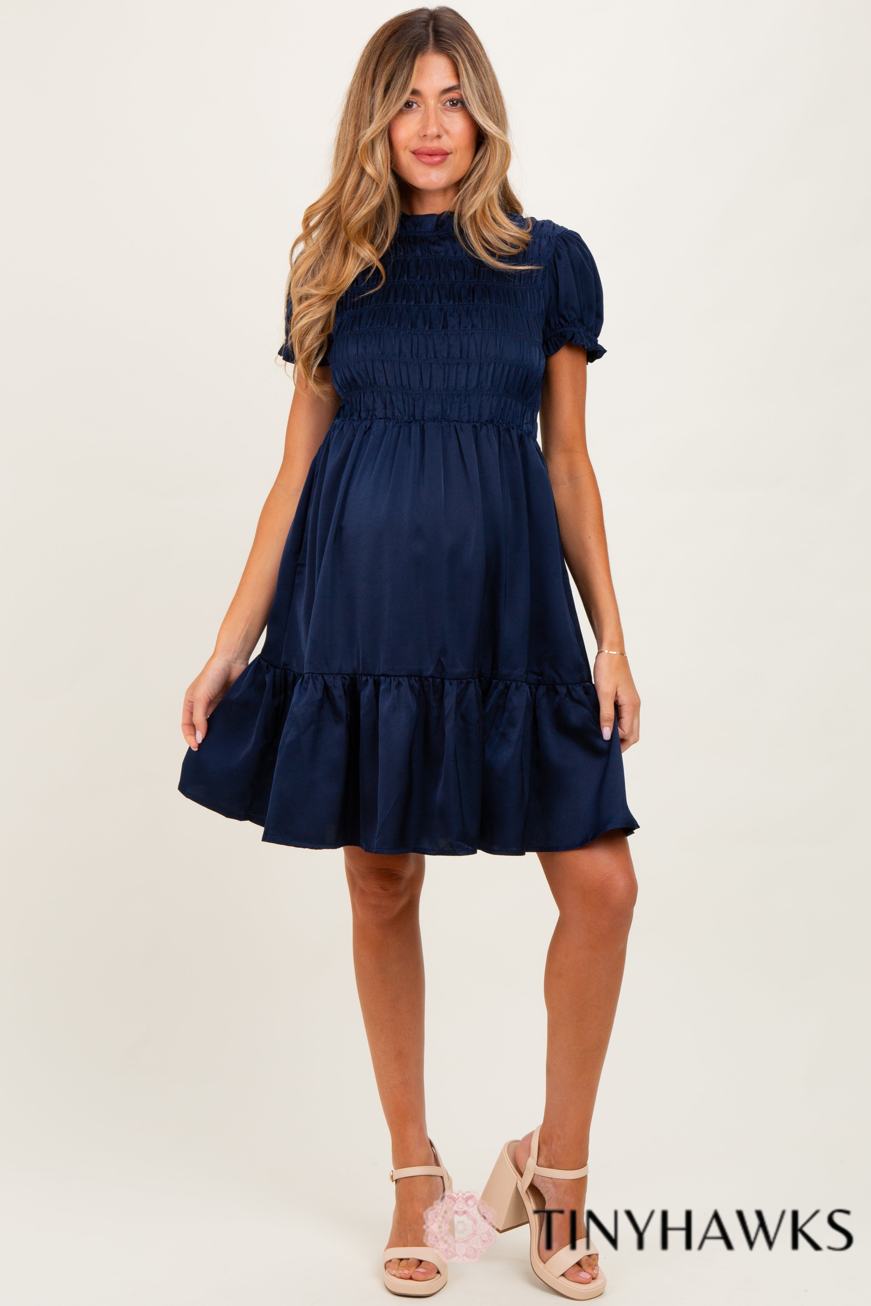 Elevate your maternity wardrobe with our Navy Satin Smocked Mock Neck Maternity Dress. Crafted from silky satin fabric, this dress features a comfortable smocked bodice that gently stretches to accommodate your growing bump. The elegant mock neck and puff sleeves add a sophisticated touch, while the ruffled hem creates a playful, feminine silhouette. Perfect for special occasions or stylish everyday wear, this dress combines comfort and chic design to make you feel confident throughout your pregnancy. Pair it with your favorite heels or flats for a versatile look that celebrates your journey in style.