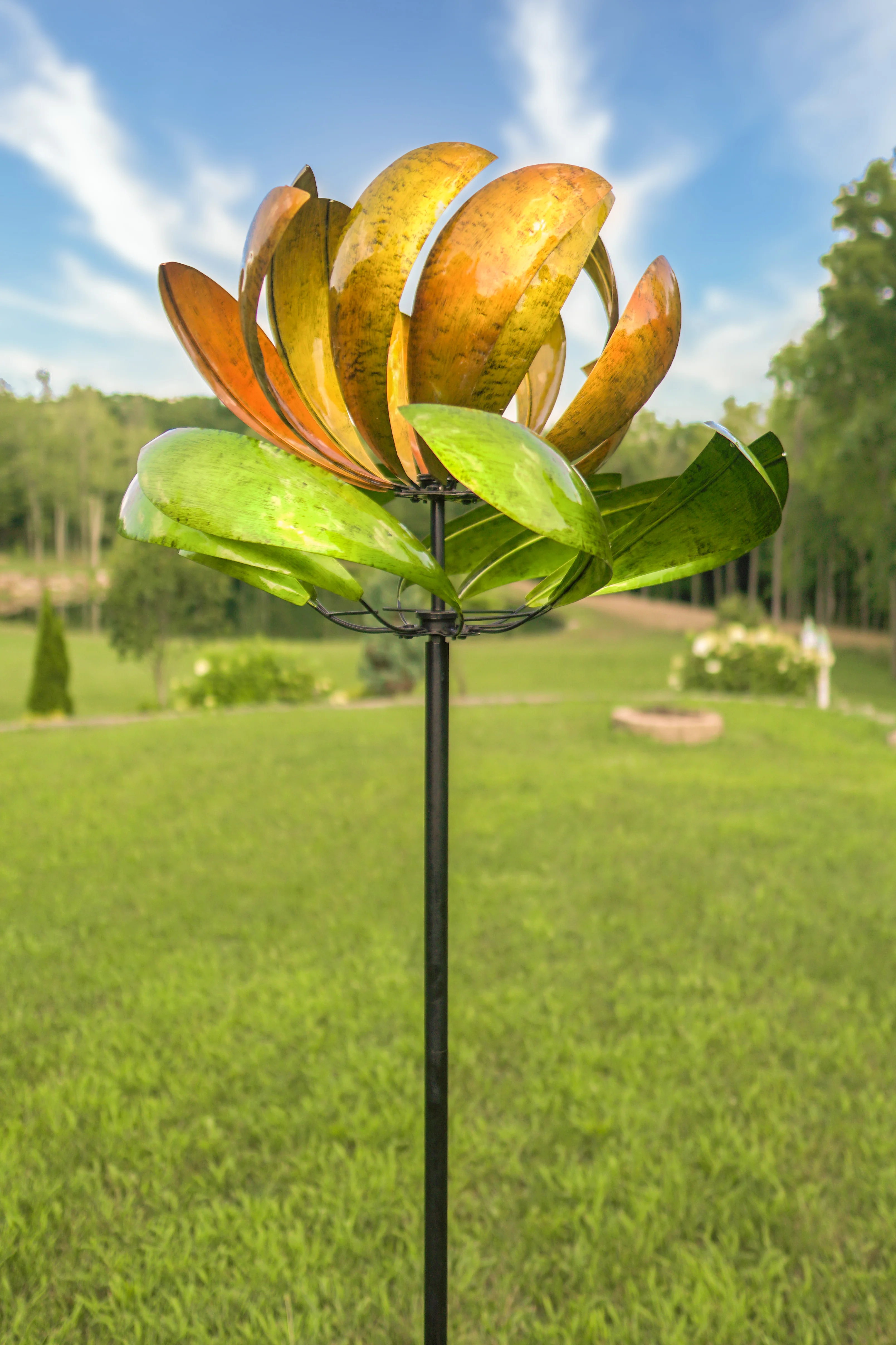 As the wind spins this metal art, you can show off your creativity and create a beautiful display in your yard.