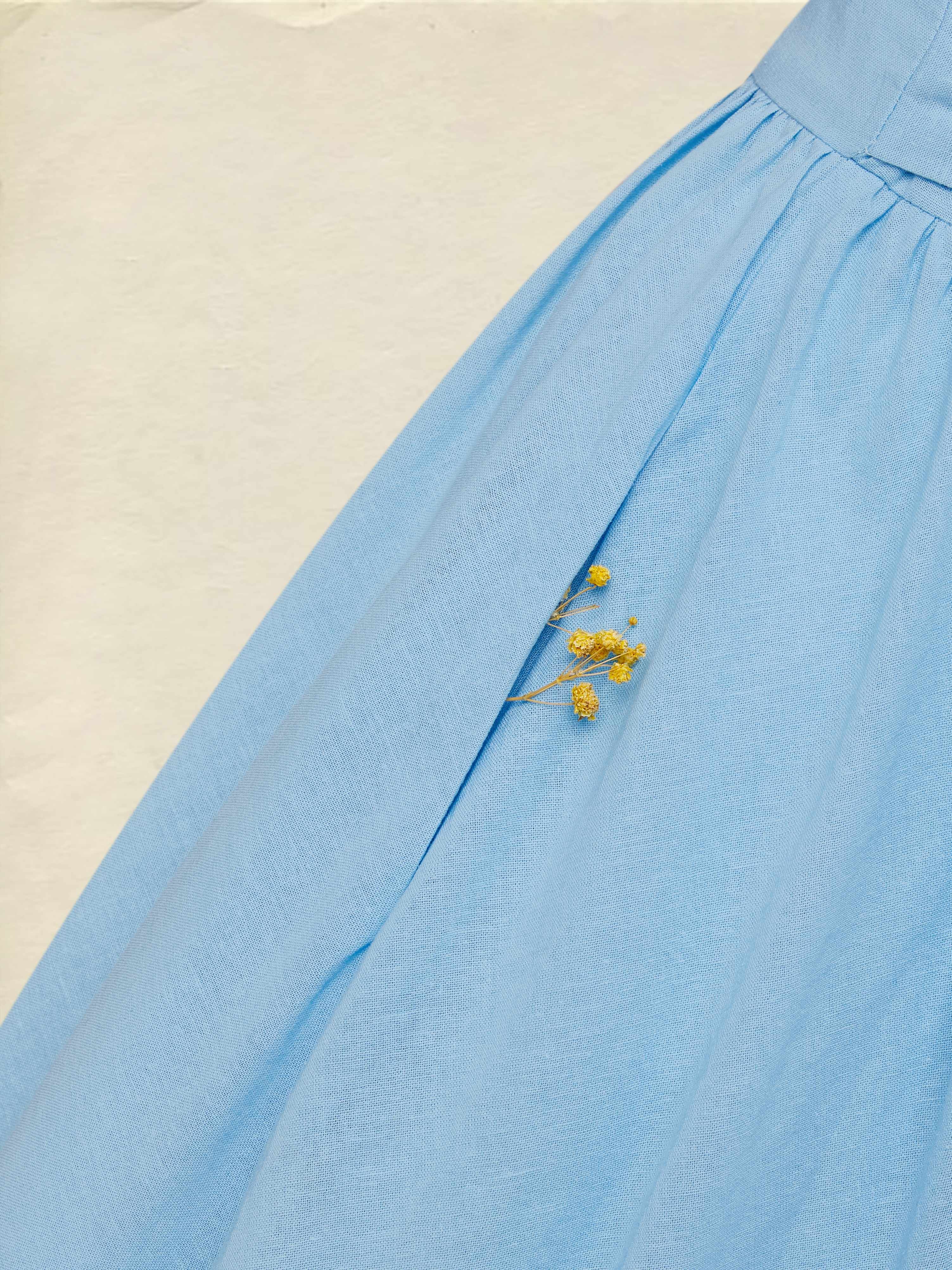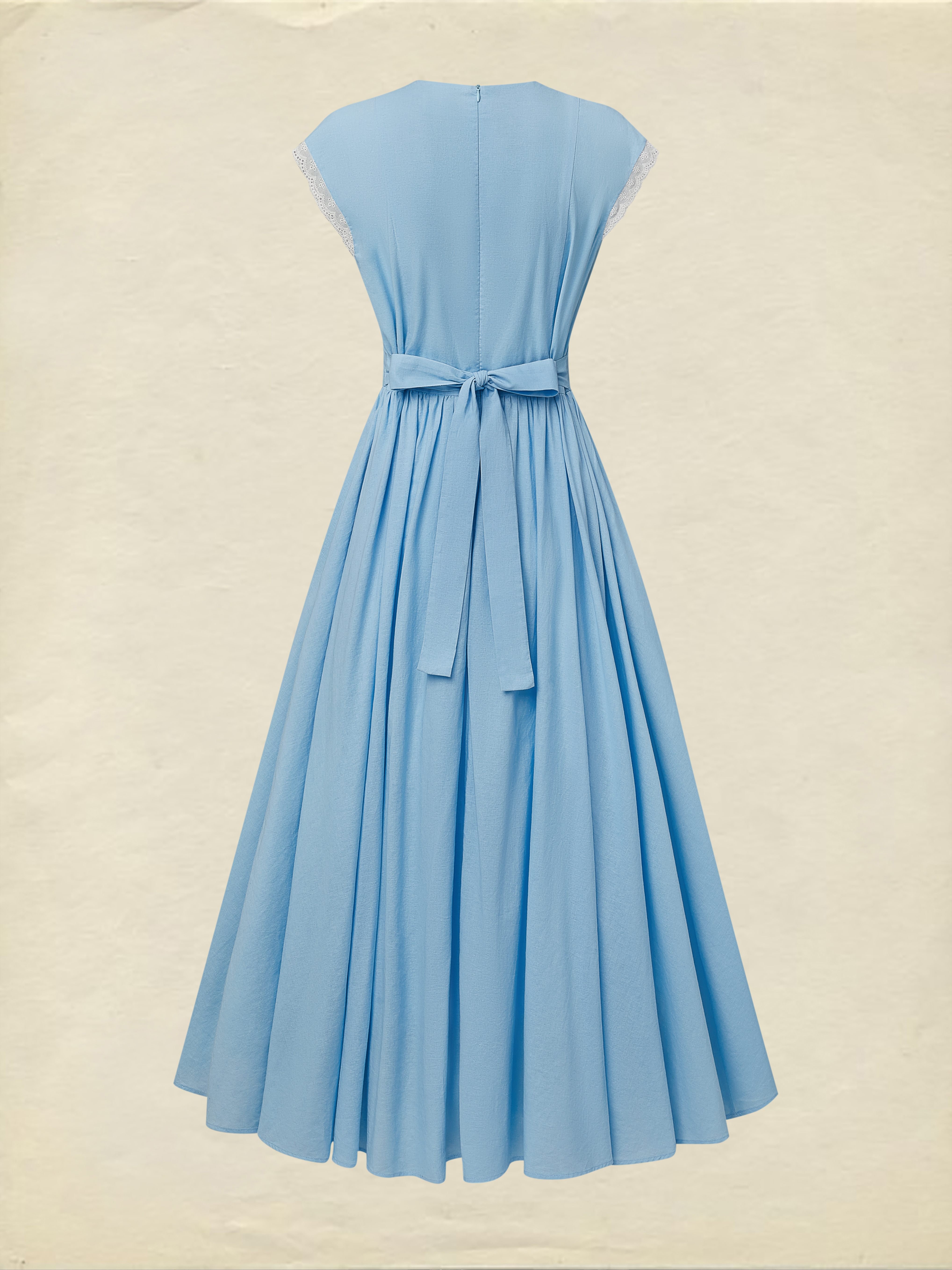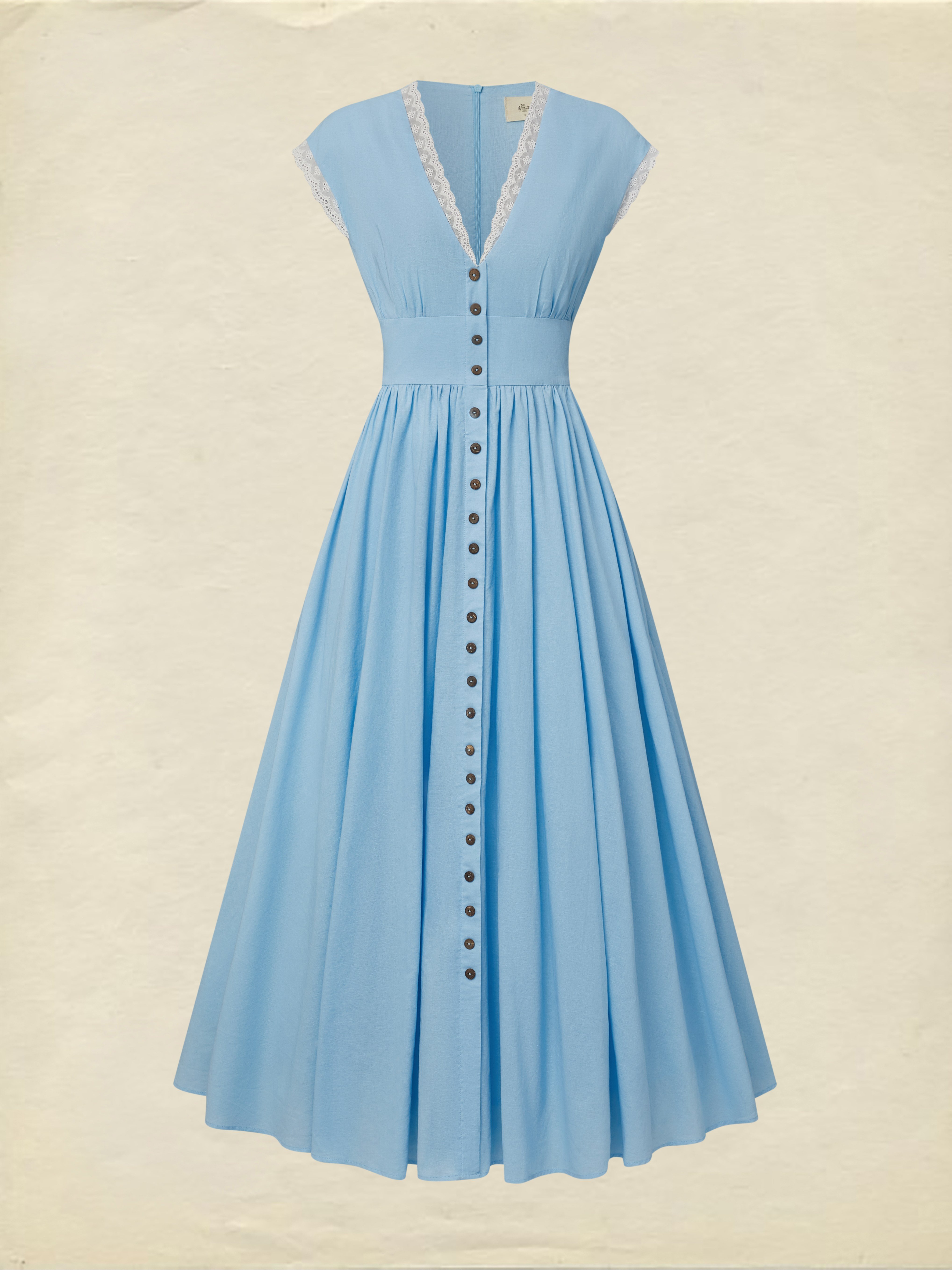 Maxi Linen Dress , Cap Sleeves, V Neck, Plain, Button Design, Vintage, Blue
